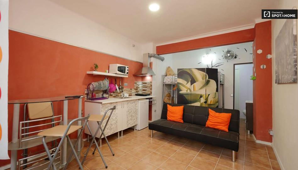 Este estudio de 30 m² está disponible para alquiler en Nou Barris, Barcelona. El estudio tiene una zona de cocina totalmente equipada con microondas y una cocina eléctrica, mientras que la zona de estar cuenta con sofá, TV de pantalla plana y una mesa y sillas elevadas. La cama es una litera y puede acomodar a dos personas, mientras que el baño tiene inodoro, lavabo y ducha.