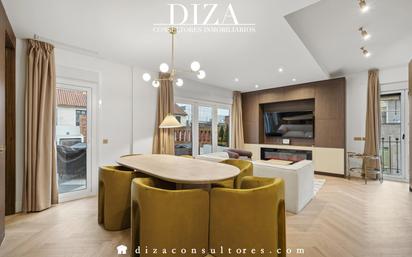 DIZA Consultores les presenta precioso ático con terraza en la mejor zona del Centro, muy cerca del Four Seasons. En la sexta planta de un edificio construido a principios del siglo XX, clásico y con un encanto único, encontramos este precioso piso de 120 metros cuadrados 100 metros cuadrados de vivienda y 20 metros cuadrados de terraza, con orientación sur y totalmente exterior en esquina, abarcando todo el torreón y fachada exterior del edificio tan emblemático. Se trata de una vivienda con muchísimo encanto donde han realizado una reforma empleando los mejores materiales y calidades que hay actualmente en el mercado, replicando así las mejores suites de los mejores hoteles de Madrid. Lo primero a destacar de la vivienda a parte su fantástica orientación y luz natural en todas sus estancias, es su altura de techos la cual nos da una sensación increíble de amplitud en toda la vivienda. La vivienda consta de un amplio área social con todo integrado, donde el protagonista es un gran ventanal que nos da acceso a la terraza. La zona de noche se compone de dos dormitorios de muy buen tamaño, ambos con baño en suite y balcón amplio a la calle, el principal cuenta con acceso directo a la terraza también y el baño del dormitorio secundario en suite, tiene un acceso también para invitados. El piso está en proceso de reforma y se ha cuidado hasta el mínimo detalle, aprovechando todos los espacios. Su ubicación es ideal se encuentra en la mejor zona del centro, rodeado de tiendas y uno de los mejores hoteles del centro de Madrid. Estaremos encantados de atenderle. DIZA Consultores Inmobiliarios Inmobiliaria de lujo en Madrid especializada en comprar, vender y alquilar pisos en las zonas premium de Madrid: Barrio de Salamanca, Almagro, Chamartín, Retiro, Pozuelo, Aravaca, Boadilla. Convertimos Sueños en Hogares