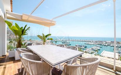 Adéntrese en este impresionante ático y déjese cautivar de inmediato por el amplio espacio de estar de concepto abierto, donde se despliega una impresionante vista panorámica del puerto y el mar. La entrada da directamente a una sala de estar espaciosa y luminosa, y a una elegante cocina totalmente equipada, conectadas armoniosamente por una pared de vidrio de suelo a techo que abarca todo el ancho del espacio. A la izquierda, una cocina moderna de diseño con acabados de alta gama invita a la creatividad culinaria, mientras que la zona de estar bañada por el sol a la derecha ofrece el entorno perfecto para relajarse y recibir invitados. Toda la zona de estar está inundada de luz natural, gracias a las enormes puertas de vidrio que se abren a una hermosa terraza que se extiende a lo largo de todo el ático, ofreciendo magníficas vistas al puerto y al mar. Un pasillo elegante conduce a cinco amplios dormitorios, incluida una lujosa suite principal que cuenta con un baño privado con ducha tipo walk-in, doble lavabo y aseo. Dos de los dormitorios disfrutan de grandes puertas de vidrio que se abren directamente a la terraza, ofreciendo magníficas vistas al mar y al puerto. En total, el ático cuenta con tres elegantes baños, todos ellos terminados con materiales de alta calidad y un estilo contemporáneo. En toda la vivienda encontramos soluciones de almacenamiento a medida y acabados de alta calidad que reflejan un diseño moderno y bien pensado. Los residentes también disfrutan del acceso a una hermosa piscina comunitaria, ideal para relajarse en los días cálidos, así como de la comodidad de una plaza de aparcamiento privada. Esta propiedad excepcional es un espacio refinado con interiores amplios, un estilo contemporáneo y espectaculares vistas al mar. Por favor, contáctenos para más información.