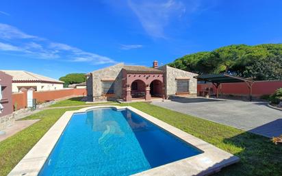 Vivienda en Chiclana de la frontera, situada en la zona de la Rana Verde, asfaltado hasta la puerta con acceso de entrada por una calle amplia. La vivienda de diseño propio, tiene un estilo rústico parecido a un cortijo andaluz, cuenta con amplios espacios y estancias muy cómodas, piedra tanto en fachada como en muro interior, vigas de madera antiguas como decoración, estilo rústico, azulejos, solería y demás materiales de primera calidad, tejas viejas de bodega, mobiliario y portajes de madera antigua restaurada, con un estilo muy cuidado, se trata de un capricho hecho al gusto de los propietarios. Además de contar con piscina propia y zona de aparcamiento para varios coches, es una vivienda que; por zona buena y bastante poblada, por diseño, que la hace muy cómoda y práctica y por cercanía a todos los servicios, se podría vivir en ella de forma permanente todo el año. Cuenta en la zona a menos de 1 km, de farmacia, restaurante, supermercados, centro de salud, colegios, etc... La vivienda cuenta con porche delantero, pasillo distribuidor ancho y cómodo, salón-comedor con chimenea, cocina amplia totalmente equipada y en funcionamiento de estilo rústico como el resto de la vivienda, con zona de comedor, despensa amplia con espacio para varias neveras, congeladores, estanterías, etc... baño completo para el público en general, dormitorio auxiliar, pasillo distribuidor con armario empotrado de apoyo desde el que se reparte la zona de noche en habitaciones amplias y 2 cuartos de baño más. El dormitorio principal, el cual está forrado completamente de piedra, con armario empotrado amplio de 6 puertas, cuenta en su interior con un baño completo en suite, con un diseño de primera y con azulejos y cenefas de artesanía sevillana. Es una vivienda que merece la pena ver y en la cual podrá pasar un largo periodo de tiempo con mucha tranquilidad disfrutando de largas horas luz por su orientación, intimidad y tranquilidad debido a su ubicación y porque no tiene ninguna propiedad de 2 plantas a su alrededor. Vengan a visitarla y le contaremos más, En cumplimiento del Decreto de la Junta de Andalucía 218/2005 del 11 de Octubre, se informa al cliente que los gastos notariales, registrales, impuestos, honorarios de la agencia y otros gastos inherentes a la compraventa no están incluidos en el precio