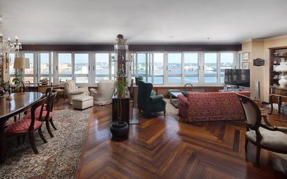 GRAN VIVIENDA DE 275 M2 CON VISTAS AL MAR EN EL CENTRO DE LA CORUÑA Exclusivo piso de 275 m2 construidos ubicado en octava planta en Avda. de Linares Rivas lo que le proporciona magníficas vistas al puerto de La Coruña y excelente orientación solar. Vivienda que ocupa toda la planta del edificio, de amplios espacios con espectacular salón de noventa metros cuadrados dotado de amplios ventanales al mar, completa y equipada cocina con entrada exterior independiente, comedor anexo, despensa y tendedero exterior cubierto, separada del salón por un amplio hall de entrada que les da acceso a ambos y al distribuidor dotado de armarios que comunica inicialmente con un dormitorio de servicio con baño al lado de la cocina y más tarde tras una práctica y agradable sala de estar con la zona de noche que incluye cuatro amplios dormitorios y tres baños (dos de ellos en suite) con luces al amplio patio de manzana al que da la parte trasera del edificio. El inmueble, en muy buen estado de conservación, dispone de calefacción individual, doble ventanal en toda la vivienda, suelos de tarima de madera, armarios empotrados en dormitorios, hall y distribuidores, iluminación empotrada, puertas de seguridad, etc.. Además cuenta con una plaza de garaje en el sótano del propio edificio con acceso directo desde el ascensor y un trastero en el bajo cubierta del mismo. Northwind inmuebles comercializa en exclusiva esta lujosa propiedad en una privilegiada situación, en el inicio de la Av. de Linares Rivas, al lado de la plaza de Orense, frente a la entrada principal del puerto de la ciudad de La Coruña, por un precio de 1.150.000 € mas impuestos.