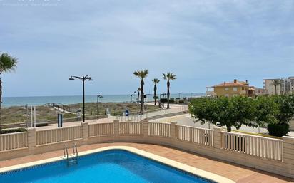 "Despierta cada mañana con el sonido del mar a tus pies" Presentamos este espectacular apartamento en primera línea de playa en Guardamar de la Safor, una verdadera joya frente al mar, ideal para quienes buscan una residencia exclusiva junto al Mediterráneo. Con acceso directo a la arena —a tan solo cinco pasos—, esta propiedad destaca por sus impresionantes vistas abiertas al mar desde una amplia terraza donde disfrutar de inolvidables amaneceres y cenas al atardecer. La vivienda cuenta con tres dormitorios dobles, perfectos para alojar a toda la familia o recibir invitados con total comodidad. Dispone de dos baños completos, salón comedor independiente muy luminoso, cocina independiente totalmente equipada, además de galería funcional. El confort está garantizado gracias al sistema de aire acondicionado por conductos (frío/calor) ya instalado, y a sus suelos de gres de fácil mantenimiento. El edificio, con ascensor y mobiliario incluido en el precio, forma parte de una urbanización privada con amplias zonas comunes, que incluyen piscina comunitaria y zonas ajardinadas, ideales para el disfrute tanto de adultos como de niños. Ubicado en una de las mejores zonas de la costa, a escasos metros del mar y rodeado de todos los servicios esenciales, este apartamento es una oportunidad única para quienes desean combinar lujo, ubicación privilegiada y estilo de vida mediterráneo.