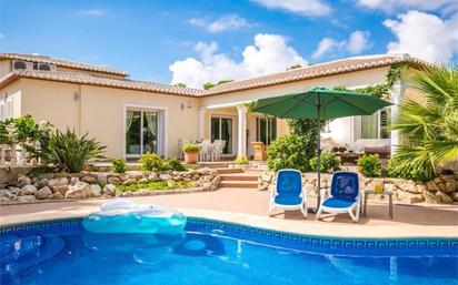 4 5 bedroom, 4 bathroom family single level villa for sale in Javea Ambolo. This immaculate 5 double bedroom, 4 bathroom spacious family villa is located in the popular area of Ambolo, walking distance to the beach, local supermarket and amenities, the main Javea Arenal beach is around a 7 min drive. The property is situated on a totally flat plot and has living accommodation distributed over 1 level consisting of spacious entrance hall opening into the open plan fully fitted American style kitchen area and dining room, from the kitchen there is access to the pool terrace and garden so ideal for outdoor entertaining, leading from the dining room there is a well equipped utility room with access to the outside side terrace. Walking from the Kitchen dining room you enter the main living area which again has double doors leading onto the covered terrace and pool, door access from the living room takes us into a double bedroom which is currently been used as a gymnasium. From the hallway there are 4 double bedrooms, consisting of guest bedroom, full family bathroom, 3 further double bedrooms all with ensuite bathrooms with the master bedroom also benefiting from a good sized dressing area. All the rooms have quality hot and cold air conditioning units and gas central heating radiators. Outside the property is totally secure and private, with double electric drive gates and pedestrian gate giving access to the large driveway with parking for several cars, from the driveway stairs lead down to the underbuild storage areaworkshop which has several totally dry rooms and provides even more scope to convert into cinema or games room if required. To the side of the property there is a BBQ terrace with built in BBQ, leading to the garden area with 10m x 5m heated swimming pool, well established landscaped private gardens with palms and a variety of plants, excellent covered terrace with access to the kitchen and living room. This is an extremely well presented and maintained