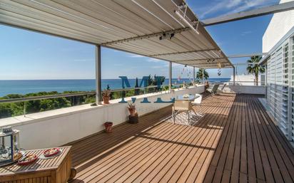 EXCLUSIVO Y ÚNICO ÁTICO DUPLEX, en Urb. Casa del Mar de Sant Pere de Ribes,entre Sitges y Vilanova i la Geltrú. Este espectacular ático destaca por sus amplias y soleadas terrazas. La principal, que rodea la zona de día y cuenta con más de 100 m², ofrece unas vistas panorámicas y despejadas al Mar Mediterráneo y al Puerto de Vilanova, desde cada una de sus estancias. La propiedad, construida en 2004, cuenta en 100m2 útiles, distribuidos en 2 plantas. La Planta Baja, cuenta con salón-comedor , cocina independiente 2 dormitorios dobles , con acceso directo a terrazas,un baño y un lavadero. En la Planta Superior, una suite principal de lujo, que incluye un baño privado y salida a terraza, desde la que se pueden contemplar espectaculares vistas al mar y al entorno natural. La propiedad incluye 2 plazas de aparcamiento en el mismo edificio y un trastero, ofreciendo comodidad adicional. La Urbanización Casa del Mar dispone de áreas ajardinadas comunitarias que incluyen dos piscinas, una de ellas tipo desbordante, espacios verdes, parque infantil y servicio de Vigilancia Privado las 24 horas. Caminando se accede a calas dirección Sitges y en 10 min llegas a las playas de Vng. Su ubicación es inmejorable, junto a reconocidos colegios internacionales: Bel-Air, Olive Tree e IBS Richmond International School. A poca distancia de Valenti Village, y su oferta en supermercados y restauración. Fácil y rápido acceso a C-32 (BCN-TGN) y Aeropuerto BCN. .