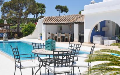 Esta impresionante villa de estilo ibicenco en venta en Sol de Mallorca ofrece el equilibrio perfecto entre elegancia mediterránea, privacidad y vida junto al mar. Ubicada en una tranquila y exclusiva zona residencial, la propiedad se encuentra a pocos pasos de hermosas playas y calas escondidas, lo que la convierte en una opción ideal tanto como residencia habitual como casa de vacaciones de lujo en Mallorca. Situada en una amplia parcela de 1.470 m² y con 330 m² construidos, la villa da la bienvenida a través de una encantadora entrada de estilo marroquí que marca el carácter único de la vivienda. En el interior, los espacios diáfanos y luminosos han sido diseñados para un estilo de vida cómodo y moderno. En la planta baja se encuentra un amplio salón con chimenea contemporánea, una elegante zona de comedor y una cocina moderna totalmente equipada. Los grandes ventanales correderos conectan el interior con las zonas exteriores, creando una perfecta continuidad entre dentro y fuera. El exterior está pensado para disfrutar del clima de Mallorca durante todo el año. Destaca una espectacular piscina privada de 14 metros, rodeada de jardines mediterráneos consolidados, zonas de relax a la sombra y un espacio de barbacoa con comedor exterior, ideal para largas tardes de verano y veladas al aire libre. En la planta superior, el dormitorio principal ofrece privacidad y tranquilidad, con baño en suite. Desde este nivel se accede a la impresionante terraza en la azotea con vistas al mar, equipada con zona lounge y comedor, perfecta para relajarse y disfrutar de las puestas de sol mediterráneas. Uno de los dormitorios se encuentra en una casa de invitados independiente con baño propio, ideal para recibir visitas con total privacidad. La villa dispone de aire acondicionado en toda la vivienda, cuenta con garaje y destaca por su diseño elegante que combina confort, sofisticación y esencia mediterránea. Sol de Mallorca es una de las zonas residenciales más demandadas del s