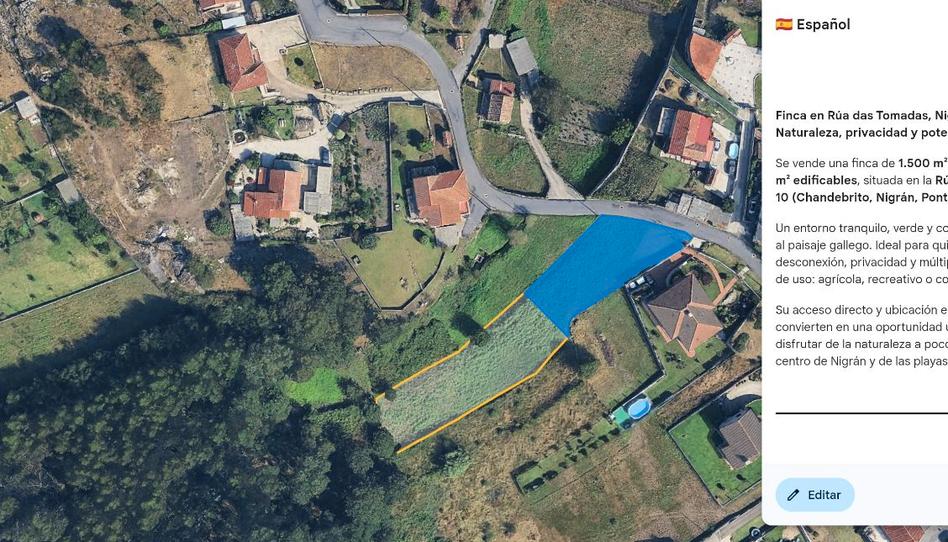 Se vende finca de 1.500 m² totales, con 600 m² edificables, situada en la Rúa das Tomadas, 10 (Chandebrito, Nigrán, Pontevedra).