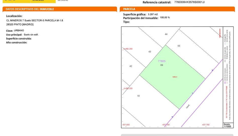 VENTA PARCELA DE 3297 M2, CALLE MINEROS , EN EL SECTOR 4-5 DE PINTO, 43% de ocupación, CERCA DE M-506, A-4 Y M-50. DISPONIBLES LAS DOS PARCELAS DE AL LADO , CON 1700 Y 1800 M2 , A 230 EUROS EL M2.