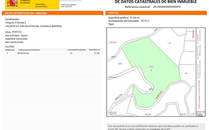 Terreno rústico en venta con una superficie de 67.348 m2 ubicado en el término municipal de San Agustín del Guadalix en el área denominada como Valdeoliva próximo a las cascadas del hervidero. La finca cuenta con fácil acceso a través de un camino asfaltado a 5 km del pueblo y cuenta con un entorno natural con árboles, cuevas, increíbles vistas y está totalmente vallada. Para más información o realizar una visita no dude en ponerse en contacto con nosotros en el 91 833 44 67, en el 652.131.026 o bien a través del correo electrónico sanagustín@viviendamadrid.com.