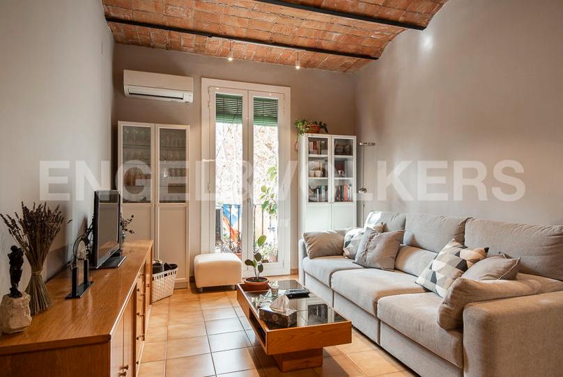 El salón comedor, reformado en el 2018, es espectacular. Tiene techos altos, balcón y volta catalana a la vista. Al no tener edificio en frente es muy luminoso gracias también a su orientación suroeste perfecta. Las vistas abiertas a la Rambla del Raval, espacio verde amplio con grandes palmeras, son simplemente mágicas. Las ventanas están equipadas de mosqueteras y son de doble cristal con cámara aislante. Ofrecen una tranquilidad óptima y un aislamiento inmejorable.