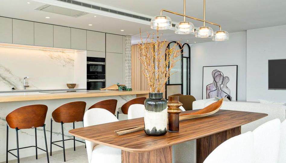 La cocina abierta con elegante isla, puertas sin tiradores y encimeras macizas, está totalmente equipada con electrodomésticos de primera calidad.