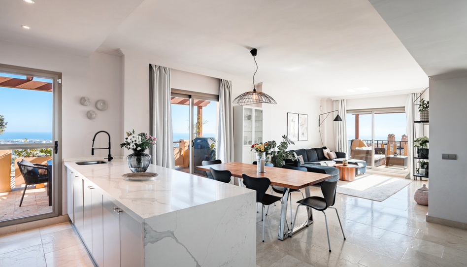 Al ingresar a la propiedad, nos recibe un elegante hall de entrada que nos invita a descubrir los tesoros que este ático tiene para ofrecer. La espaciosa sala de estar y comedor, inundada de luz natural, se abre a dos espléndidas terrazas. Una de ellas, orientada al sureste, regala vistas a la imponente montaña La Concha, al sereno campo de golf de Atalaya y al azul infinito del mar. Mientras tanto, la segunda terraza, ubicada al sur/suroeste, nos deleita con panorámicas que abarcan desde el mar Mediterráneo hasta las icónicas siluetas de Gibraltar y el norte de África.