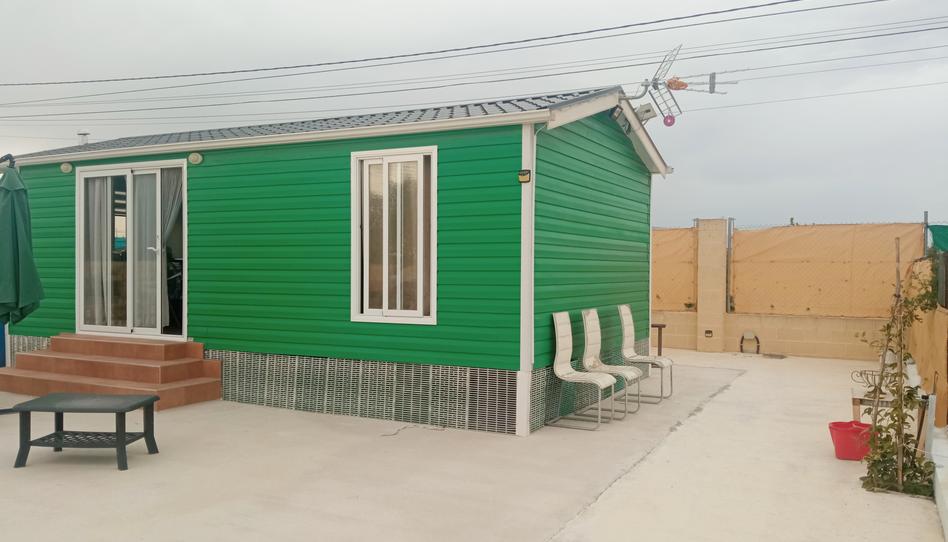 Casita prefabricada con dos dormitorios con armarios, un baño completo con ducha, salón comedor cocina, barbacoa, agua y luz.