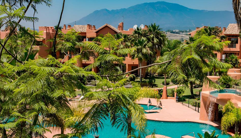 Encantador apartamento de 3 dormitorios y 2 baños, amplio, en la primera planta, con una gran terraza orientada al suroeste que da al jardín tropical, la piscina, la fuente y al campo de golf, el mar Mediterráneo, Gibraltar y África. Un entorno idílico para disfrutar de una sangría y comer al aire libre.