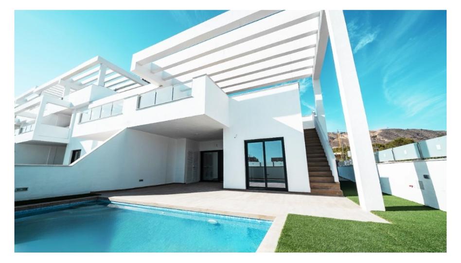 Los bungalows de planta alta cuentan con una superficie desde 164,22 m² construidos, distribuidos en 3 amplias habitaciones, 2 baños, un salón-comedor con cocina diáfana, una terraza de 16,88m2 y un magnífico solárium de 78.66 m² con opción a piscina privada en el solárium.