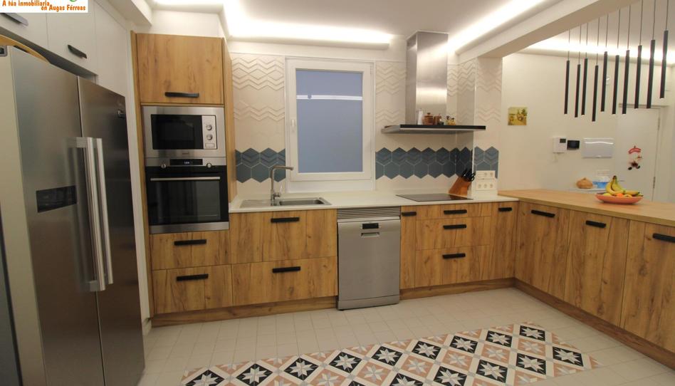 La cocina es el corazón de la casa, con módulos efecto madera, barra de desayuno y suelo cerámico creando calidez.