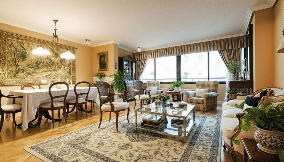 La vivienda destaca por su gran salón-comedor. Un espacio diáfano con grandes ventanales que llenan la estancia de luz natural durante todo el día. Desde aquí se disfruta de una vista despejada hacia el jardín con piscina del edificio. Esto aporta una sensación de amplitud y tranquilidad poco habitual en pleno centro de Madrid.