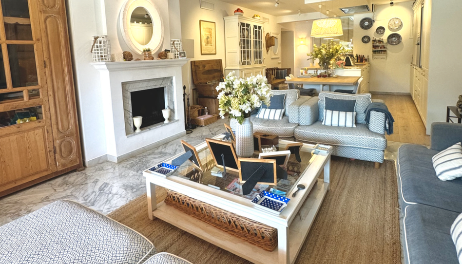 El espacioso salón se divide en dos áreas distintas. Por un lado, la zona de estar, con una encantadora chimenea, se abre a un luminoso porche que hace las veces de segundo salón y comedor. Por otro lado, la cocina americana, de generosas dimensiones, se integra perfectamente al salón y cuenta con una mesa de comedor.