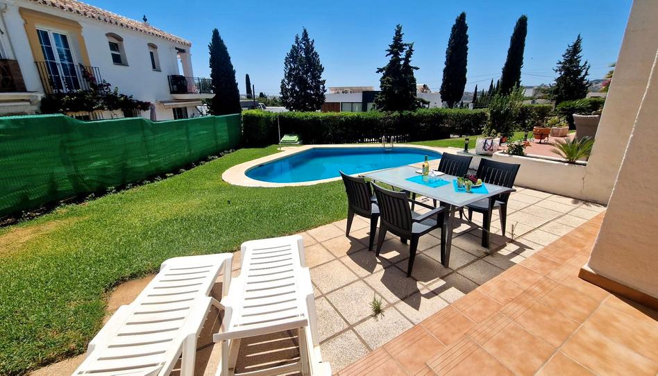 Magnífica casa adosada en esquina con soleadas terrazas en Mijas Golf. Con una superficie construida de 120 m2. Año de construcción 1984. Orientación Sur. Esta propiedad se encuentra en una pequeña urbanización de 4 casas con una encantadora piscina con césped y una plaza de aparcamiento para cada vivienda. En la planta baja tenemos la cocina independiente equipada y con pasaplatos, un baño con ducha y un salón-comedor con chimenea y aire acondicionado. En la planta primera tenemos 2 dormitorios dobles con armarios empotrados y terrazas con fantásticas vistas al mar, además de un baño familiar. Vivienda muy acogedora. Suelos de mármol, jardín comunitario. Cerca de transporte público, campo de golf, colegios, etc. Visita recomendada.