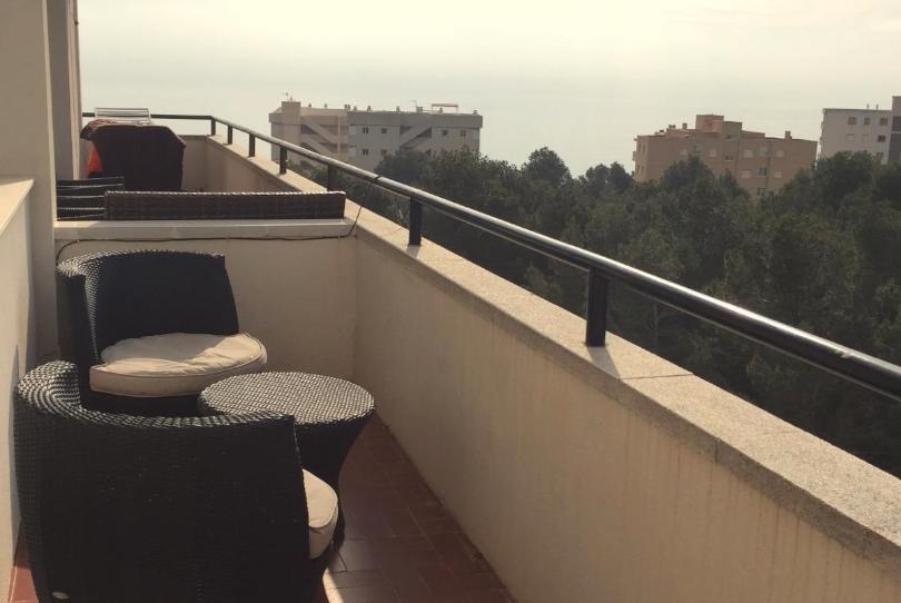 -salon comedor con salida a terraza y vista al mar y piscina