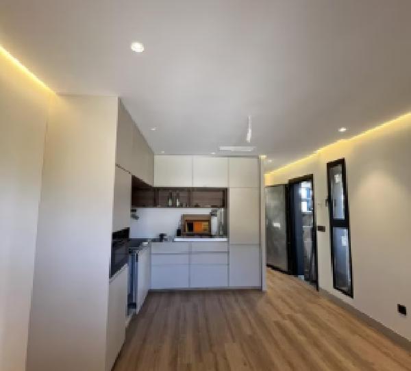 Un moderno salón-cocina totalmente equipado con electrodomésticos (horno, lavadora, microondas, nevera), creando un ambiente funcional y acogedor para tu día a día.