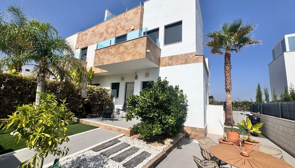 <p><strong>Acogedora casa adosada de dos plantas con solárium, vistas al mar y piscina comunitaria</strong></p> <p>Esta encantadora vivienda adosada, distribuida en dos plantas más solárium, combina funcionalidad y confort en un entorno tranquilo con vistas abiertas a la montaña y al mar.</p> <p>En la planta baja se encuentra una moderna cocina integrada en un luminoso salón-comedor, junto a un baño completo. La planta superior ofrece dos dormitorios, ambos con baño en suite, y acceso a una agradable terraza con vistas a la montaña.</p> <p>Todos los baños de la vivienda están equipados con <strong>suelo radiante</strong>, proporcionando un extra de confort durante todo el año.</p> <p>En la planta superior, el amplio solárium es el lugar perfecto para relajarse al aire libre y disfrutar de las vistas panorámicas al mar y a la naturaleza.</p> <p>La parcela cuenta con zona de parking, terraza/patio exterior, áreas ajardinadas con césped natural, palmeras y árboles frutales. La vivienda dispone de armarios empotrados, persianas eléctricas en toda la casa, aire acondicionado central y acabados pensados para el confort.</p> <p>Además, el complejo residencial ofrece una piscina comunitaria ideal para refrescarse y disfrutar del clima mediterráneo.</p> <p>Una propiedad ideal para vivir todo el año o como residencia vacacional.</p>