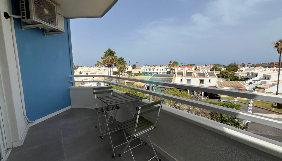 La distribución incluye zona de descanso con cama doble y armarios empotrados, baño completo, cocina abierta y una acogedora sala de estar que conecta directamente con una terraza de 6 m², con orientación sur y vistas panorámicas a la urbanización Golf del Sur y al entorno.