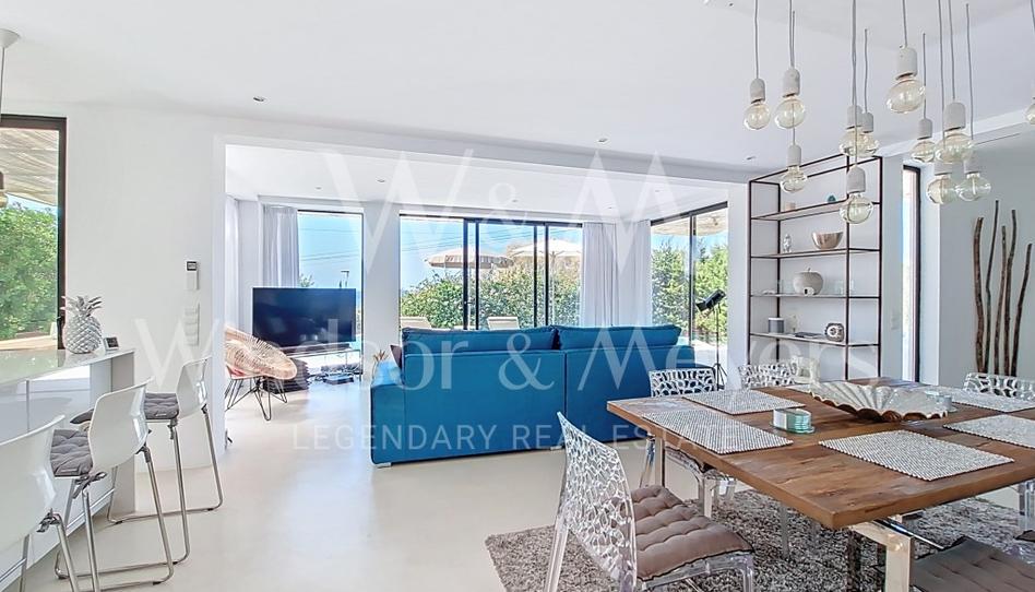 El salón-comedor se integra de manera fluida con la cocina, que destaca por su amplitud y su gran isla central, además de su excelente iluminación natural. Desde el sofá se disfrutan unas vistas inigualables a Es Vedrà, creando un entorno perfecto tanto para relajarse como para compartir momentos únicos.
