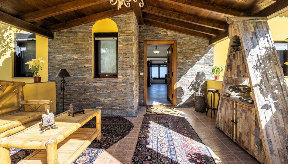 Un luminoso y espacioso salón con chimenea y grandes ventanales que ofrecen vistas panorámicas y acceso a una amplia terraza o porche delantero.