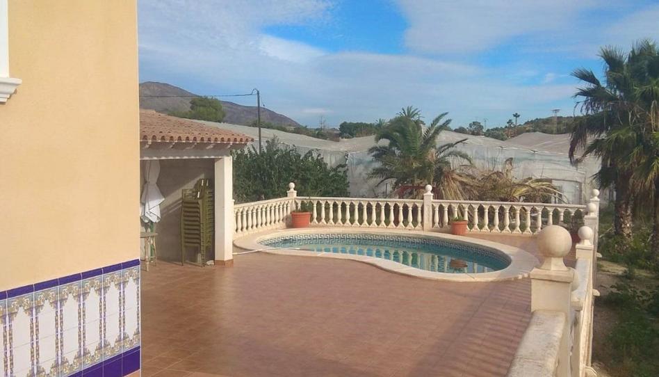Finca de 12.600m2 con casa construida y gran invernadero en funcionamiento. La casa está en una planta elevada y se podría construir la planta baja. Dos habitaciones, amplio salón, dos baños completos y cocina. Terraza soleada con piscina y barbacoa.