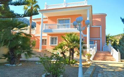Lujosa Villa en Calpe - Esta prestigiosa villa de unos 460m² tiene una fantásticas vistas sobre el mar y está situada en una parcela de 3.560m², llana y arbolada. La casa está muy bien equipada, con todas las comodidades imaginables, lo que hace de esta propiedad la perfecta villa de lujo. Las puertas de entrada eléctricas conducen a un parque con jardín donde encontrará un estanque, una fuente y una pérgola. De allí se pasa a un amplio garaje con espacio suficiente para varios coches. La villa dispone de dos plantas, que se dividen de la siguiente manera: en la planta baja hay tres dormitorios, dos baños y una oficina. El dormitorio principal es muy espacioso y tiene un precioso cuarto de baño con una gran bañera y jacuzzi. También tiene una ducha y el inodoro y el bidé están en un cuartito separado. Todas las habitaciones están conectadas por un pasillo central, independiente del hall de entrada. Tanto este pasillo como la escalera que conduce al piso superior, presentan revestimientos de mármol italiano de alta calidad. En el piso superior se encuentra la muy espaciosa sala de estar que está dividida en varias secciones separadas por columnas y arcos. Una de las secciones cuenta con sofás de cuero y chimenea, un perfecto lugar para relajarse, y en la noche, disfrutar del ambiente romántico proporcionado por la iluminación, que puede ser regulada, y el cielo estrellado. El área de la TV está a su vez cuidadosamente equipada con sofás de cuero y tiene acceso a un balcón donde se pueden disfrutar las fantásticas vistas sobre la ciudad de Calpe y el mar. La zona del comedor, también separada por arcos, ofrece un montón de espacio para reuniones de grupos numerosos. En la misma planta encontramos una amplia cocina con despensa, así como un precioso dormitorio en suite. Dormitorio y baño están separados solamente por un gran arco lo que le da un toque único y especial. Todas las habitaciones están equipadas con sistemas de sonido de alta calidad, por lo que p