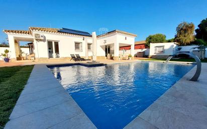 Impresionante villa de 4 dormitorios, 3 baños, piscina privada climatizada, jardín y aparcamiento, a solo 5 minutos en coche de la playa de La Barrosa. La Villa Rita ha sido cuidadosamente renovada por sus actuales propietarios, que han llevado a cabo una reforma completa utilizando exclusivamente materiales de alta calidad. Esta gran villa está bellamente diseñada tanto por dentro como por fuera y ofrece mucho espacio para disfrutar del estilo de vida español bajo el sol, en una ubicación muy codiciada, a solo 5 minutos en coche de la galardonada playa de La Barrosa. A continuación se ofrece una breve descripción de las instalaciones: La entrada a la villa principal, a través de la primera de las dos terrazas cubiertas, conduce al vestíbulo principal, que está revestido con baldosas de mármol de alta calidad, las mismas que se encuentran en la mayor parte de la casa. A la izquierda se encuentra el luminoso y acogedor salón principal, con chimenea, ventana salediza y aire acondicionado con función de calefacción y refrigeración. Frente al salón se encuentra la puerta del dormitorio principal, con puertas acristaladas oscilobatientes que dan a la piscina y a la terraza, armarios empotrados y un cuarto de baño privado recién reformado con ducha, lavabo con mueble y WC. Si se sigue por el pasillo y se gira a la izquierda, se llega a la fantástica cocina equipada con electrodomésticos empotrados de primera calidad. Una puerta abierta conduce a lo que antes era el comedor formal y que actualmente se utiliza como segunda sala de estar, con puertas que dan al jardín lateral y al lavadero trasero. De vuelta al pasillo, se accede a dos amplios dormitorios dobles, uno de ellos con armarios empotrados y puertas dobles abatibles y giratorias que dan a la segunda gran terraza cubierta y a la terraza de la piscina. Todas las habitaciones están equipadas con aire acondicionado con función de aire caliente y frío. También hay un cuarto de baño familiar recién renovado con ducha, lavabo con mueble bajo y WC. En el exterior, frente a la villa principal, se encuentra el apartamento de invitados con salón, cocina americana, cuarto de baño familiar con ducha y habitación doble, también con aire acondicionado (frío/calor). En la zona exterior se encuentra la piscina privada climatizada con energía solar, orientada al sur y muy soleada. El jardín es principalmente de césped, aunque hay una zona vallada detrás de la villa para crear un jardín más pequeño dentro de la propiedad, perfecto para mascotas o como zona segura para que los niños jueguen lejos de la piscina. La terraza que rodea dos lados, incluidas las terrazas cubiertas, ofrece mucho espacio para tomar el sol o para barbacoas al aire libre. En un pequeño trastero se encuentra la bomba de la piscina y hay espacio para guardar las herramientas de jardín. Junto al apartamento de invitados hay un jardín más pequeño y vallado, en el que se han plantado varios árboles frutales. Bonitas palmeras y arbustos autóctonos en flor adornan el jardín y las terrazas. Una superficie pavimentada de hormigón ofrece suficiente espacio para aparcar varios vehículos, mientras que una puerta de entrada eléctrica con mando a distancia y una puerta peatonal facilitan el acceso a la propiedad desde la tranquila calle. Otras características son: Ventanas y puertas con doble acristalamiento en toda la casa.Mosquiteras en todas las ventanasAire acondicionado recién instalado en toda la casaPuertas interiores y marcos de puertas de roble macizo recién instaladosSistema fotovoltaico con una potencia de 8 kW y tarifa de alimentación a la red eléctrica principal.Sistema de descalcificación de aguaSistema de riego automático para el jardínGastos Notariales, Registrales, IVA y Honorarios de intermediación (2,5% + IVA) no están incluidos en el precio de venta
