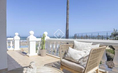 Esta hermosa vivienda pareada en primera línea de la playa ofrece unas vistas impresionantes al mar y un estilo de vida mediterráneo en su máxima expresión. Totalmente reformada con excelentes calidades y una decoración que evoca la esencia del Mediterráneo, esta propiedad de 193 m² es perfecta para quienes buscan confort y belleza junto al mar. La vivienda cuenta con un parking privado con una plaza, brindando comodidad y seguridad. Además, dispone de un jardín mediterráneo de bajo mantenimiento, ideal para disfrutar del exterior sin preocuparse por tareas complicadas. La comunidad en la que se ubica ofrece una piscina compartida, perfecta para relajarse y disfrutar del buen clima de la zona. Distribuida en varias plantas, en el semisótano encontrarás una habitación doble y un baño, ideal para invitados o uso como sala de juegos. La primera planta alberga una moderna zona de día con cocina abierta y un amplio salón comedor, perfecto para disfrutar en familia o con amigos. En la planta superior, hay dos habitaciones dobles, una de ellas con baño en suite, además de un baño completo adicional. La buhardilla ofrece un espacio multiuso que puede ser un despacho, gimnasio o sala de ocio, adaptándose a tus necesidades. Las ventanas de PVC con cristales de Climalit garantizan un excelente aislamiento y confort en toda la vivienda. Dispone de aire acondicionado por máquinas de splits, ventiladores y calefacción mediante radiadores de gas.