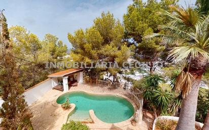 Impresionante villa con vistas al mar y a Santa Eulària des Rio, Ibiza, ofrece 181 m² de espacio habitable distribuidos en dos plantas, ya que en su planta superior ofrece un gran solárium con barbacoa en sus 97m2, con unas vistas al mar. La propiedad cuenta con 4 dormitorios, 2 baños y 3 salas de estar, ofreciendo un amplio espacio para disfrutar en familia o recibir invitados. Su arquitectura de inspiración mediterránea se caracteriza por sus distintivas ventanas arqueadas, que inundan los interiores de luz natural y ofrecen vistas panorámicas. La cocina destaca por su cálida decoración de madera, electrodomésticos modernos y un gran ventanal con vistas al jardín. Las salas de estar son amplias y diáfanas, y una de ellas cuenta con un sofá seccional blanco curvo y chimenea, creando un ambiente acogedor. Los dormitorios son luminosos y minimalistas, algunos con ventanas arqueadas y armarios empotrados. En toda la casa, encontrará una armoniosa combinación de elementos tradicionales y diseño contemporáneo. Los suelos son predominantemente de mármol, y algunas habitaciones tienen suelo de madera. Los baños son modernos y elegantes, con mamparas de ducha de cristal y grifería de diseño. El espacio exterior es igualmente impresionante, con escaleras de piedra que atraviesan un jardín repleto de plantas mediterráneas autóctonas, incluyendo imponentes palmeras y olivos, y se recorre todo el perímetro de la casa y del cual se accede desde diferentes puntos a su piscina la cual dispone de vistas al mar. Esto crea un ambiente sereno, propio de un resort, que complementa a la perfección los espacios interiores. Con su combinación de amplios interiores, características arquitectónicas distintivas y exuberantes zonas exteriores, esta villa ofrece una experiencia de vida ibicenca por excelencia. No pierdas la experiencia de visitarla.