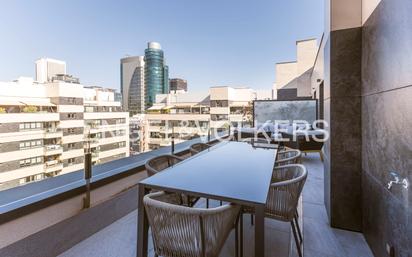 Engel & Völkers presenta este espectacular ático - duplex ubicado en un privilegiado entorno: una urbanización de obra nueva con piscina y zonas comunes, que se encuentra además a escasos metros del Paseo de la Castellana. La vivienda se ofrece completamente amueblada y equipada para entrar a vivir ya. En la planta superior, el hall de entrada da paso a un amplio salón-comedor con salida a una espectacular terraza de aproximadamente 30 m2. Unas puertas correderas comunican la zona del comedor con la espaciosa cocina (equipada con placa de inducción, horno, microondas, vinoteca, 2 frigoríficos, lavavajillas, lavadora-secadora). Esta planta cuenta también con un baño para invitados con ducha. Una moderna escalera con barandilla de vidrio conduce a la planta inferior, de carácter más privado, en la que se encuentran 5 dormitorios y 3 baños. Todos los dormitorios son dobles, el principal está en suite y tiene acceso a una agradable terraza. Uno de ellos se utiliza como cuarto de estar, y cuenta con sofá-cama. Dos de los baños están equipados con ducha (entre ellos el principal), y el tercero disponde de bañera. La casa tiene gran capacidad de almacenamiento, con armarios empotrados en todos los dormitorios y en el hall de entrada. Con respecto a las instalaciones, la climatización se realiza a través de un suelo radiante refrigerante combinado con un sistema por conductos en el techo de aire frío -calor. Se trata de un sistema muy eficiente (aerotermia centralizada con consumos individualizados, eficiencia energética A). Se trata de una construcción de muy alta calidad: ventanas con triple acristalamiento, domótica categoría premium (la más alta de esta promoción), persianas eléctricas... El edificio en el que se encuentra, de reciente construcción, dispone de piscina para adultos y para niños, parque infantil, gimnasio, sala para celebraciones familiares… y es muy seguro, ya que cuenta con portero 24 horas. La vivienda se ofrece con un trastero de 6 m2. Se pueden incluir 1 o 2 plazas de aparcamiento grandes (una de ellas con cargador ), por 150€ adicionales cada una. La propiedad se encuentra en el distrito de Chamberí, en el barrio de Ríos Rosas-Nuevos Ministerios. Está muy cerca del centro financiero de AZCA, de la zona comercial de El Corte Inglés de Castellana, así como de calles con restaurantes de moda como Ponzano. Se trata de un área muy bien comunicada por transporte público (estación de metro y de cercanías de Nuevos Ministerios, así como numerosas líneas de autobuses) y que también ofrece un acceso muy rápido al centro de la ciudad y a las carreteras principales (M-30, A-1, etc), a través de Raimundo Fernández Villaverde o del Paseo de la Castellana.