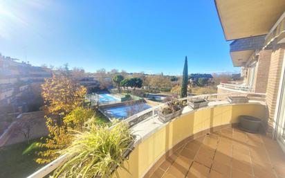 Piso duplex ático de 165 m2 en Majadahonda La distribución es: Planta tercera. Gran salón con terraza, cocina con cuarto de lavandería , cuatro dormitorios ( uno de ellos con baño en suite) y dos baños. Planta cuarta . Tiene una terraza de 40m2 con vistas de 360 grados y habitación para de almacenamiento para muebles de terraza, macetas, herramientas de jardín... Dispone de 2 plazas de garaje y trastero. La urbanización tiene zonas verdes y piscina . Se puede ir andado al centro de Majadahonda. Parada de autobús muy cercana.