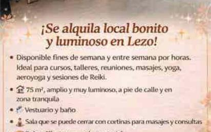 Alquilo local muy bonito y luminoso en Lezo, fines de semana y por horas. Ideal y acondicionada para cursos, talleres, reuniones,yoga, aeroyoga,masajes,Reiki... 75m a pie de calle Consta de una sala separada por cortinas para consultas, masajes la cual se puede añadir al espacio más grande. Vestuario y baño. Buhardilla para guardar material. 25Hora 1H semanal fija 95 mes 2H semanales 180 mes 1 5arde completa280 mes Fines de semana: Medio día (4H) 90 Día completo 160 Sábado y Domingo 300