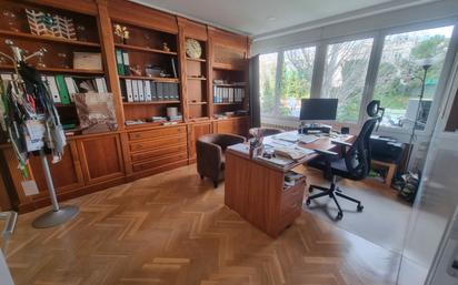 Se alquila oficina 70m2 en la Torre del Retiro, edificio emblemático de Madrid. Disponible para mediados de febrero. Exterior y muy luminosa. Lista para entrar a trabajar, separaciones paneladas fácilmente modificables, ahora mismo consta de tres despachos, uno de ellos tiene también sala de juntas. Ofice-cocina y aseo. Estanterías de madera medida. Tiene aire acondicionado en todas las estancias y calefacción central incluida en el precio. Segunda planta muy luminosa y con amplios ventanales con vistas a la calle. Edificio con seguridad 24h, posibilidad de aparcamiento, varios ascensores, zonas verdes y piscina. ABSTENERSE AGENCIAS.