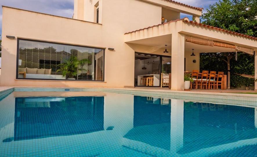 La propiedad se ubica sobre una parcela privada de 600 m², con amplias zonas exteriores y piscina privada, perfecta para disfrutar del clima mediterráneo durante todo el año.