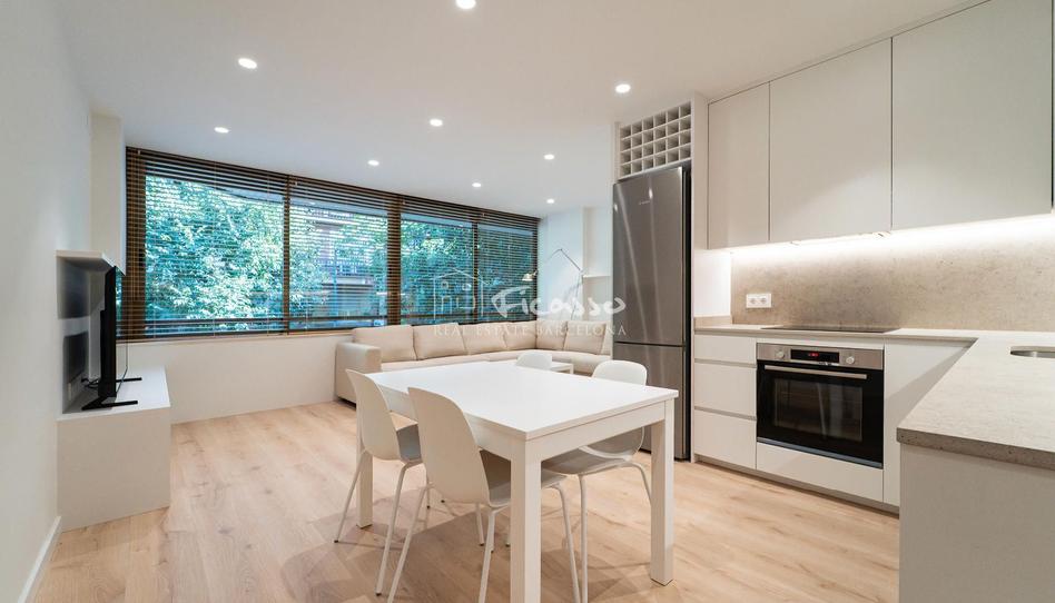 El salón-comedor tiene grandes ventanas que abren a la calle semi-peatonal, ofrecen vistas a los arboles y disponen de persianas venecianas que permiten regular la entrada de luz. El salón está amueblado con un cómodo sofá esquinero, TV de pantalla plana y una mesa y sillas para cuatro. La cocina moderna está completamente equipada con lavavajillas, horno, placa de inducción, microondas, nevera y extractor.