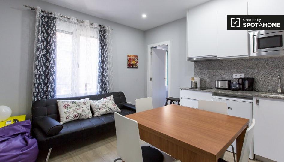 ** El abrazo con estilo ** _Porque me encanta un apartamento acogedor, acogedor._ ** ¿Me gustará aquí? ** Tal vez. ¿Encuentras espacios acogedores con montones de estilos que coinciden con tu estilo de vida? Buena ubicación una necesidad también? Este podría ser el indicado para usted. **¿De Verdad? Dime más...** Usted puede acurrucarse en este encantador encantador. Bebiendo té mientras estás acurrucado en el sofá. Cocinando algo fragante en la cocina. Creemos que es ideal para un trabajador o postgrado que busca una morada acogedora. Tampoco podrías estar en una mejor ubicación, con el metro y las tiendas tan cerca. ** Sus 3 razones principales para vivir aquí: ** - Nos encanta el barrio encantador. ¿Un paseo por el Jardí Botànic Històric a alguien? - Puedes disfrutar del cómodo sofá cuando necesites relajarte y descansar. - Te encantará la novedad de tener una mesa de comedor, especialmente cuando tienes amigos que te visitan. ** Pero necesitas saber esto ... ** - No hay lavadora, pero no hay problema, hay una lavandería a solo 3 minutos. ** Nuestro Homechecker, Angie, dijo: ** _ \"Me encanta esta propiedad. No solo se ha renovado recientemente, sino que también se encuentra en una ubicación excelente \". _ ** Dame esto directamente ... ** Este es un acogedor apartamento de 1 dormitorio en la 1ª planta de la Gran Vía de Les Corts Catalanes, Barcelona. Aquí se trata de las vibraciones hogareñas, especialmente en la cómoda área de estar de planta abierta. Creemos que este apartamento es perfecto para un postgrado o trabajador que desea una casa en una excelente ubicación. Con todo lo que necesita en su puerta, la vida es fácil aquí.