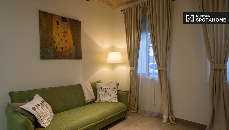 Este moderno estudio en Carrer Del Marroc, en Poblenou, está muy bien decorado y acogedor. La propiedad exterior tiene una zona de dormitorio y de estar combinada con una cama doble, sofá, televisión y una cocina con todos los utensilios necesarios para cocinar. También hay un baño moderno.