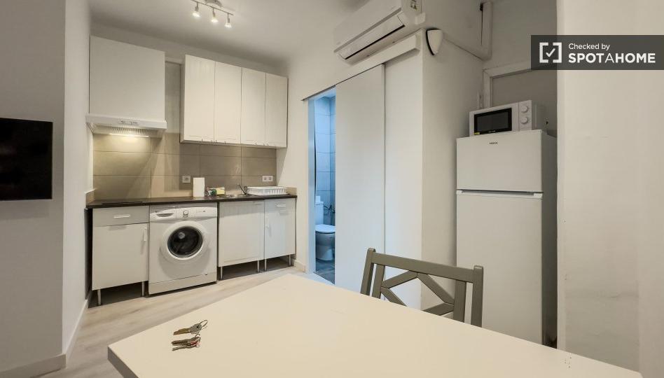 Bienvenido a un estudio amueblado en alquiler en el vibrante barrio de El Fort Pienc, Barcelona. Esta propiedad está totalmente equipada con cocina, lavadora, horno y aire acondicionado individual para su comodidad. Aunque no tiene balcón, este estudio ofrece un espacio acogedor, perfecto para la vida urbana. Tenga en cuenta que no se permiten mascotas ni fumar en la propiedad.
