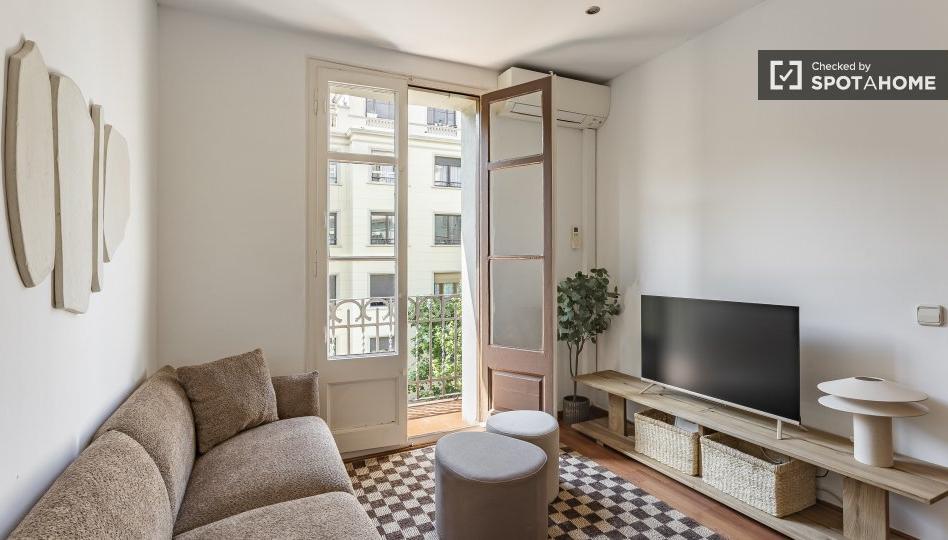 Este elegante apartamento de 2 dormitorios en La Nova Esquerra de l'Eixample es perfecto para profesionales y también para parejas. La propiedad está completamente amueblada y ofrece una cocina equipada con electrodomésticos modernos, incluyendo lavadora, secadora y lavavajillas. El apartamento también cuenta con aire acondicionado central y balcón, lo que garantiza una experiencia de vida cómoda y agradable. El propietario de esta propiedad ha superado todos los procesos de verificación de Spotahome, lo que garantiza su confianza y seguridad, verificado por nuestro verificador de viviendas.