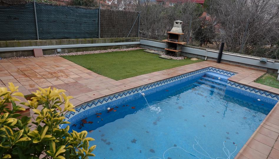 Pati privat posterior amb jardí, barbacoa d'obra i piscina.