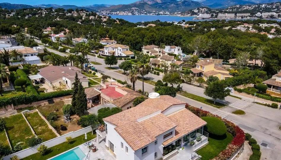 Maravillosa Villa de lujo de 280 m2 + 50 m2 de terrazas + 35 m2 de piscina en parcela de 900 m2, con grandes terrazas con vistas a las montañas, GRAN PISCINA DE AGUA SALADA Y JARDÍN PRIVADO ubicada en Nova Santa Ponsa, a pocos minutos de la playa y del golf.