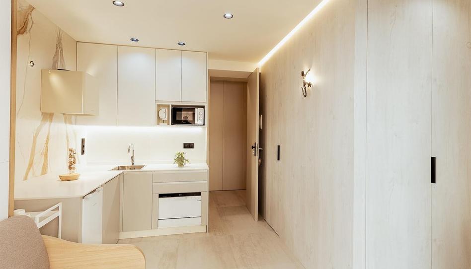 En la calle CÉNTRICA de la ciudad de Elda, nos encontramos este coqueto estudio recientemente reformado con un diseño funcional y minimalista. En sus 24 metros cuadrados se resuelven las necesidades básicas de la vivienda. El espacio es eficiente configurado de manera flexible y ágil con tres ambientes: estar-cocina, dormitorio, el baño y la terraza. Todo permanece conectado entre sí creando un auténtico espacio vital. El cuarto de baño está en otra estancia independiente. Es un nuevo concepto de alojamiento que podría asemejarse a un apartahotel. El acceso al estudio es a través de una puerta de más de 2,50 metros de suelo a techo color beige, que le confiere elegancia, una mayor sensación de continuidad y espacio.