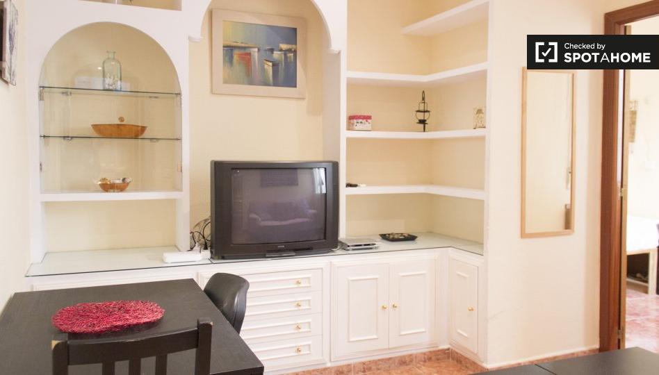 Este apartamento de 2 dormitorios disponible para alquilar en Cuatro Caminos es una acogedora propiedad de 60 m². Un apartamento interior, tiene un ambiente tranquilo. Hay techos altos, paredes de colores y todas las comodidades y electrodomésticos necesarios. La sala de estar tiene un sofá cama y una pequeña mesa de comedor, y la cocina está totalmente equipada.