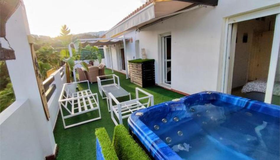 Espectacular Ático en La Cala de Mijas de Larga Temporada ( contrato por 5 años)! Cuenta con dos habitaciones con armarios empotrados, baño con bañera, cocina independiente completa, salón luminoso, terraza de 90 m2 con total intimidad, vistas al Mar Mediterraneo, campo de golf y montañas, tiene toldos, pergola, jacuzzi con agua caliente para disfrutar todo el año, barbacoa, suelo de mármol, aire centralizado, dos plazas de aparcamientos privados subterraneo y trastero. La urbanización tiene dos piscinas, una abierta todo el año, zona de juegos infantiles, dos pistas de padel gratis, seguridad 24 hs, conserjeria y amplios jardines! Se hace Seguro de Impago.
