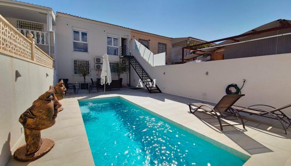Jardín vallado con piscina y plaza de aparcamiento.