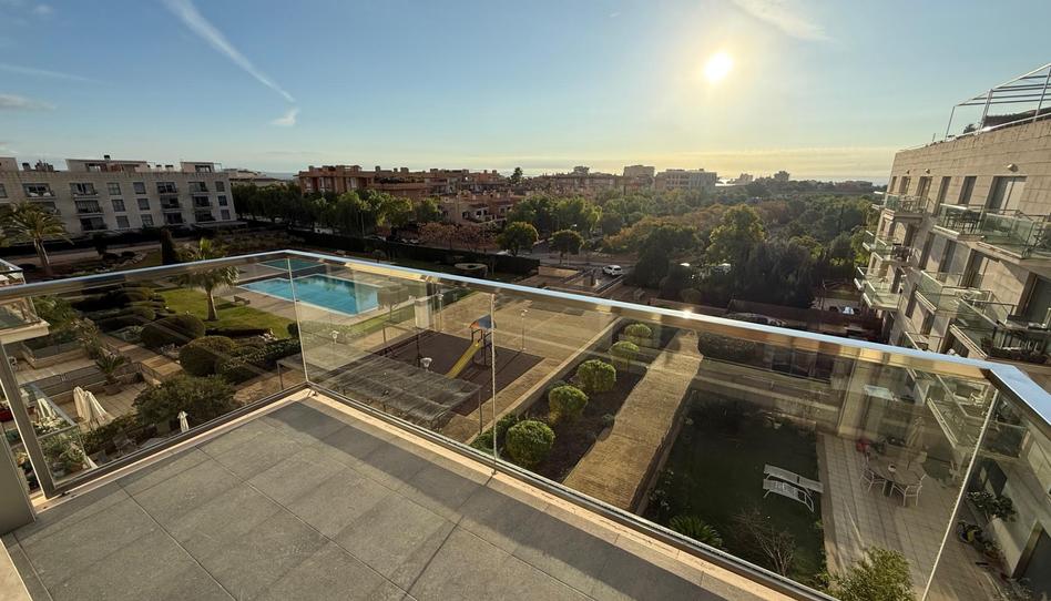 Ático en Camí dels Reis, vivienda en planta tercera, terraza privada con acceso a través de la propia vivienda en planta cuarta. Ascensor, parking para coche grande , trastero de 7 m2, piscinas comunitarias, parque de niños y jardines. Se alquila solamente para larga duración. La vivienda está completamente equipada, con aires acondicionados por conductos, independientes en cada estancia, gas ciudad para el agua caliente. Un baño con bañera, y otro con plato de ducha. La terraza privada de 60 m2, cuenta con un toldo extraíble de 9m2 para que se pueda comer en verano.